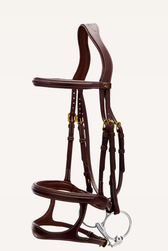 Ogłowie Dy'on z podwójnym nachrapnikiem z kolekcji D Collection. Kolekcja D Collection charakteryzuje się kremowymi przeszyciami i mosiężnymi okuciami. Posiada gładki prosty naczółek.